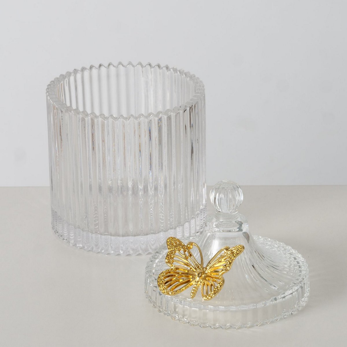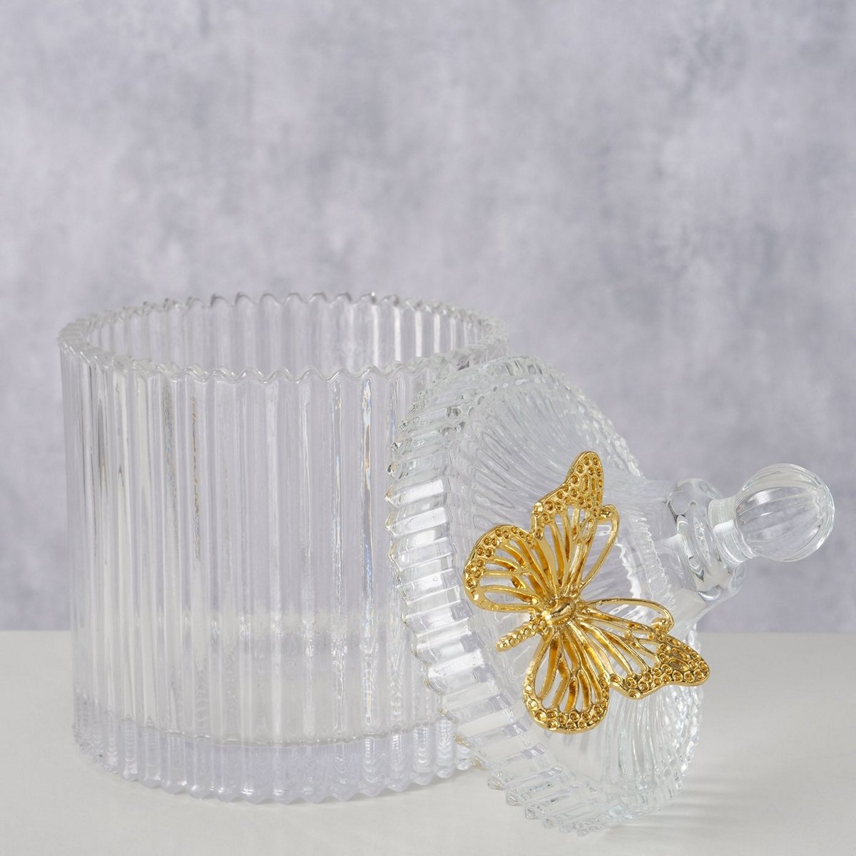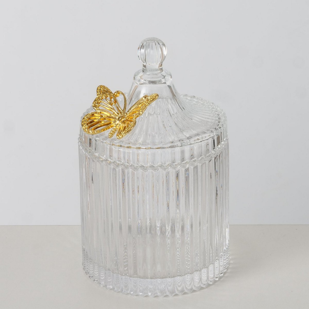 ΔΟΧΕΙΟ ΜΕ ΚΑΠΑΚΙ Farfalla ΔΙΑΦΑΝΕΣ ΓΥΑΛΙ ΜΕ ΧΡΥΣΗ ΠΕΤΑΛΟΥΔΑ H17cm D10,5cm